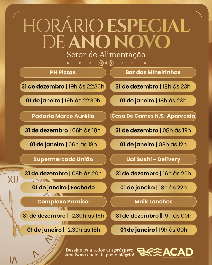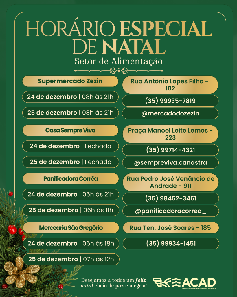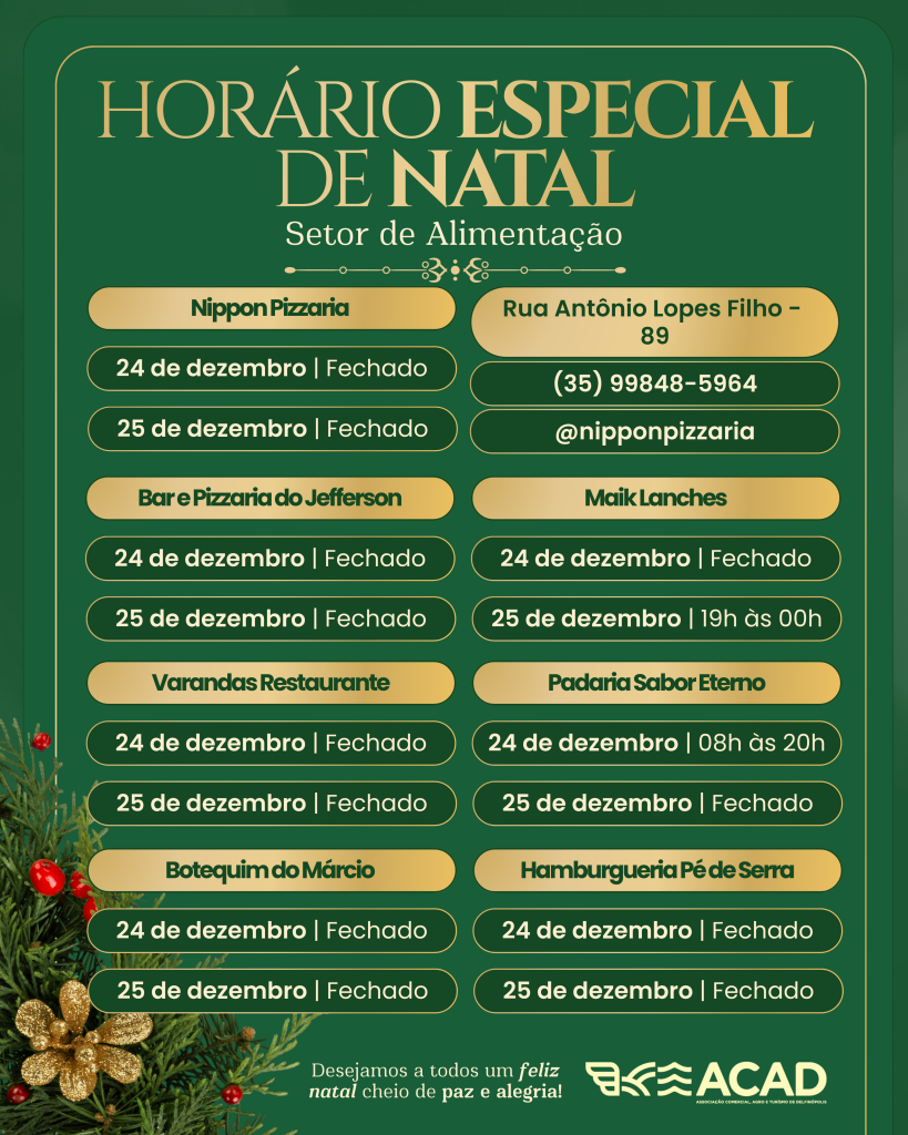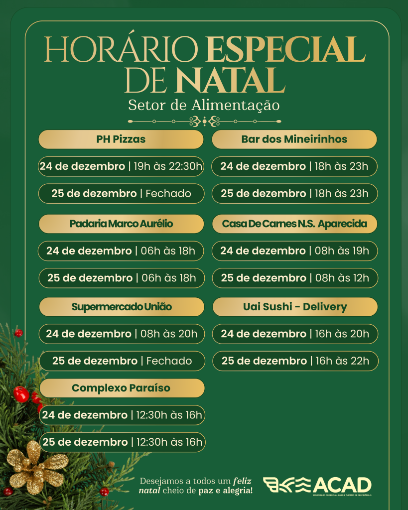 Com a proximidade das festividades de fim de ano, a Associação Comercial, Agro e Turismo de Delfinópolis (ACAD) divulgou o levantamento dos horários especiais de funcionamento do setor de alimentação durante o período natalino e de réveillon.