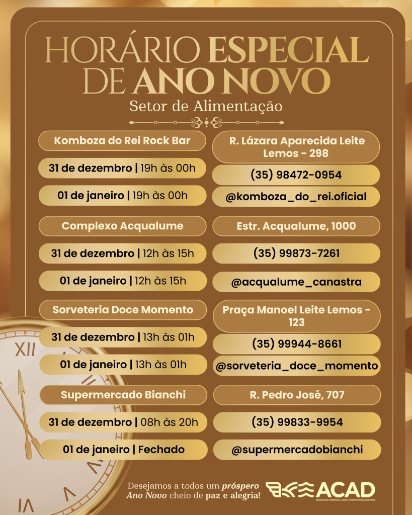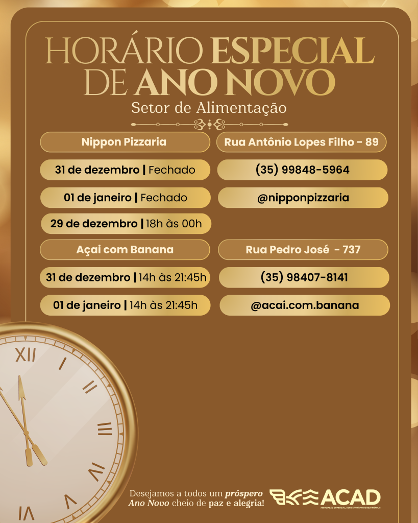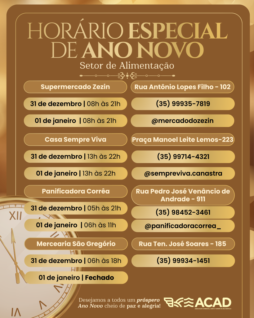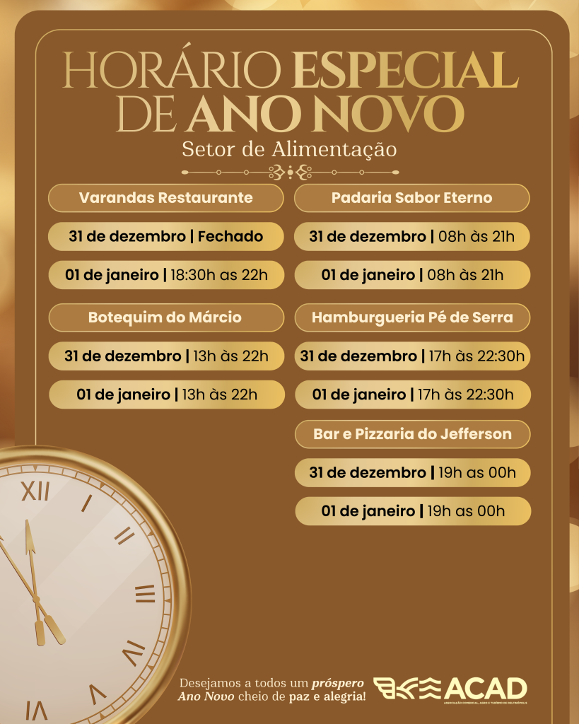 Com a proximidade das festividades de fim de ano, a Associação Comercial, Agro e Turismo de Delfinópolis (ACAD) divulgou o levantamento dos horários especiais de funcionamento do setor de alimentação durante o período natalino e de réveillon.